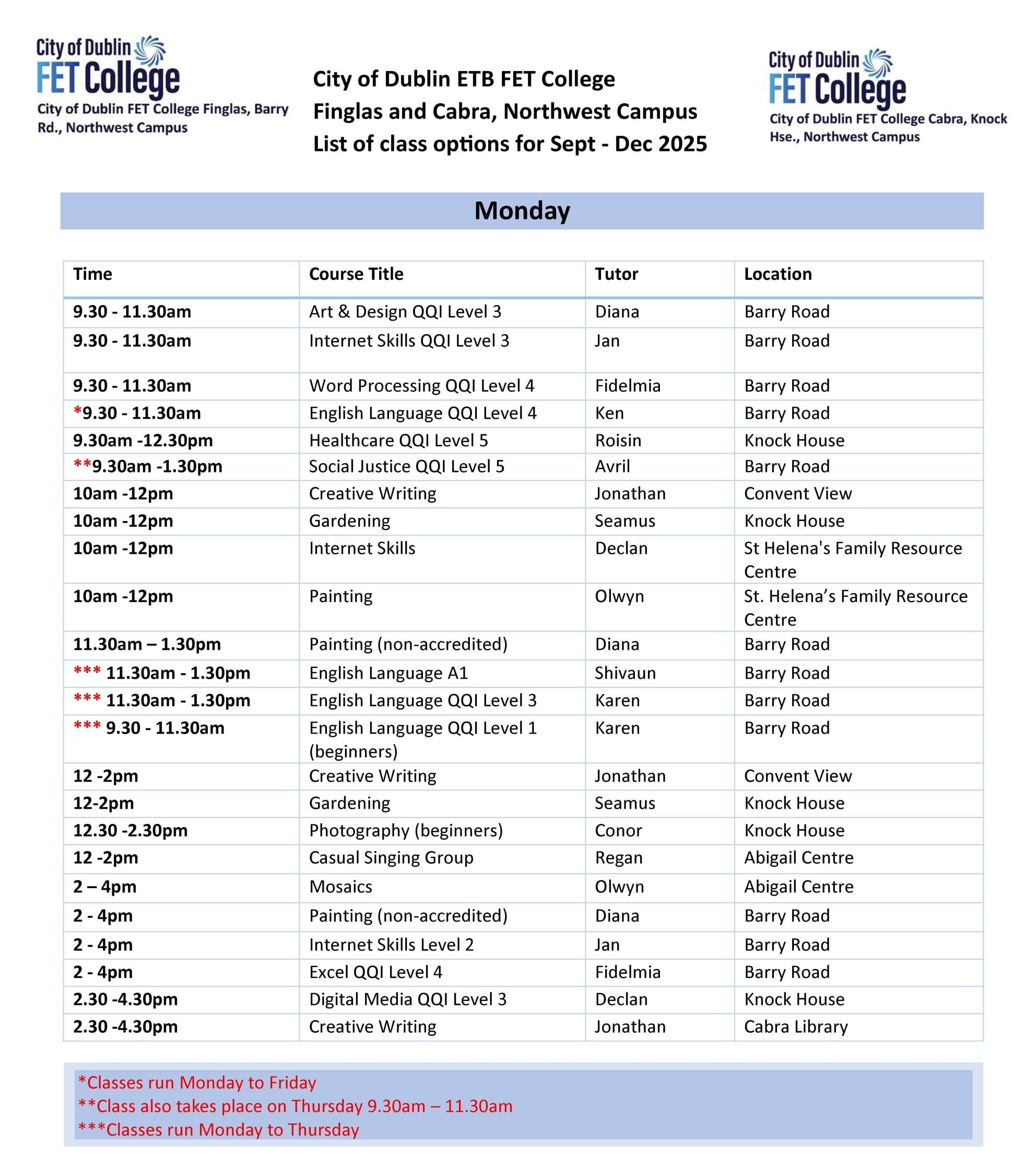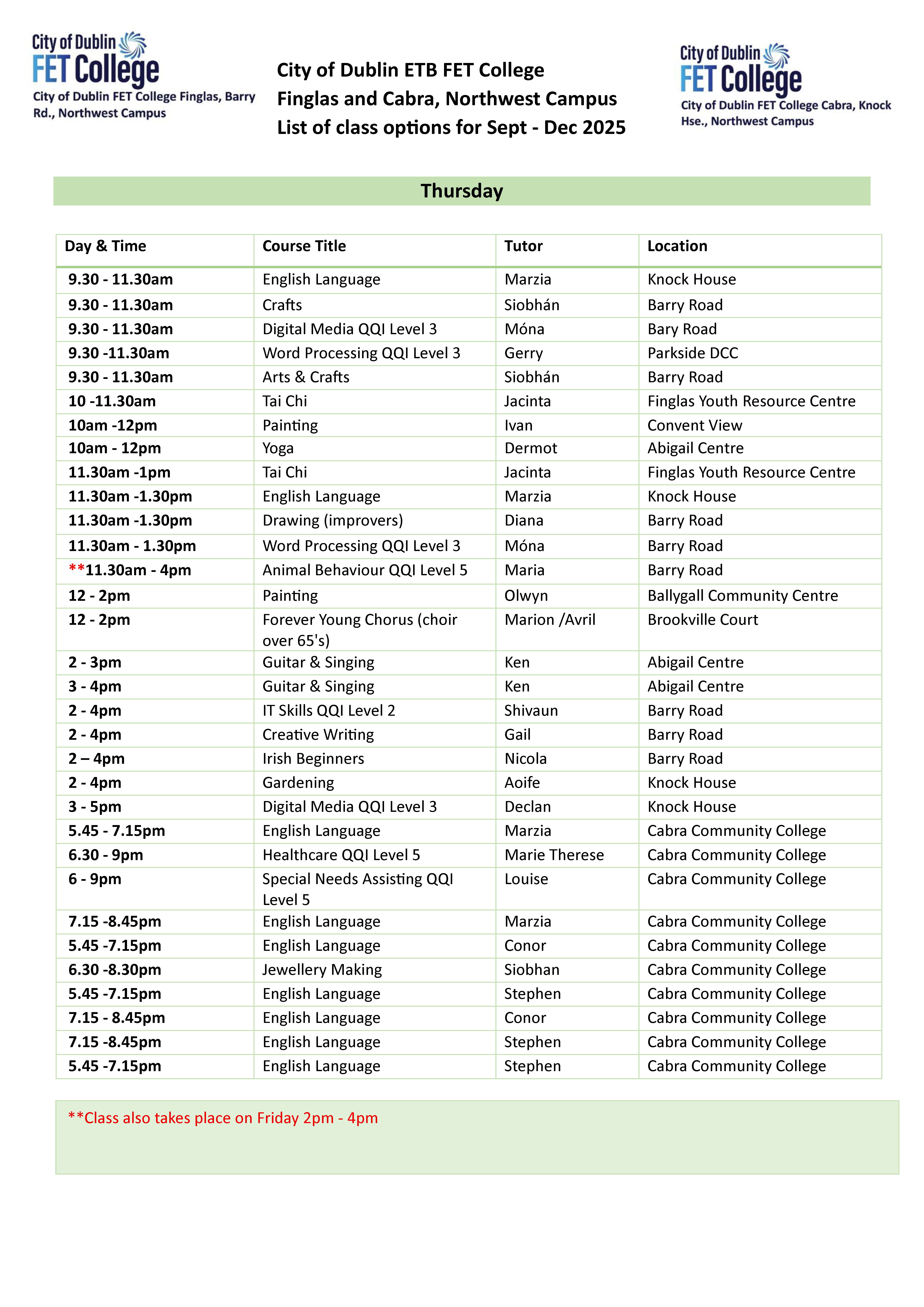 September-December Timetable 2025